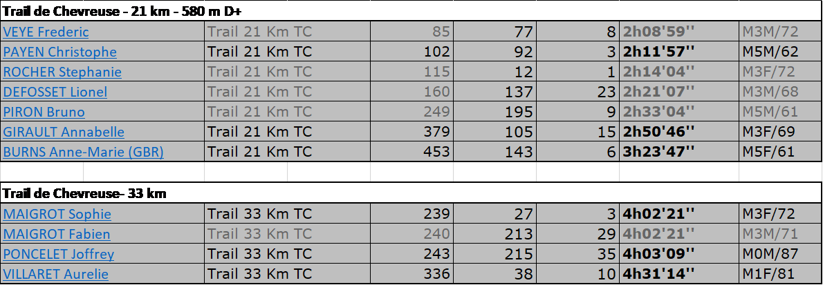 Vous trouverez ci-dessous les résultats de ces 2 trails, en notant la très belle première place de Fanny dans sa catégorie sur le 21 km du Trail de Chevreuse ainsi que les 3ème places de Christophe et Sophie dans leur catégorie respective sur le 21 et le 33 km du même trail de Chevreuse !